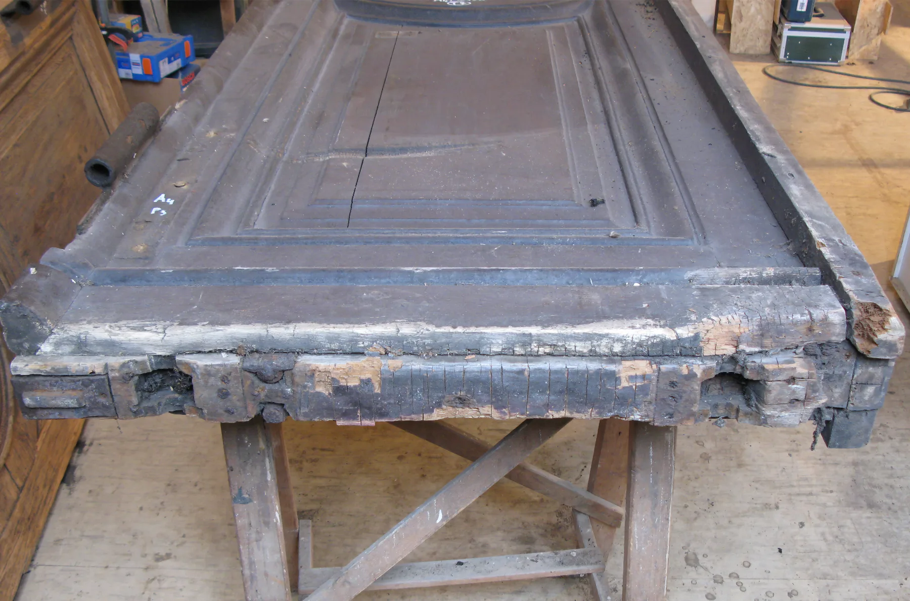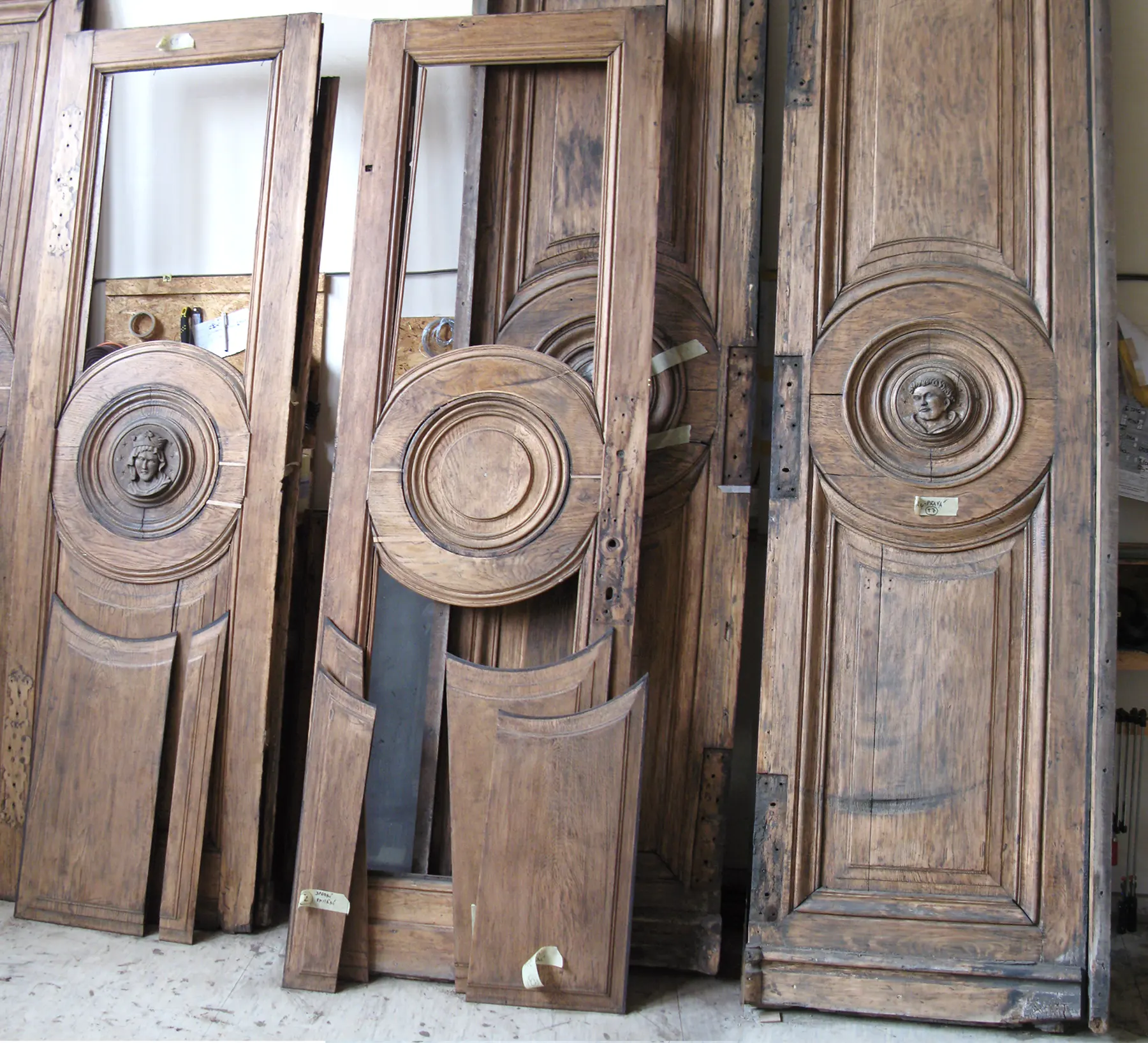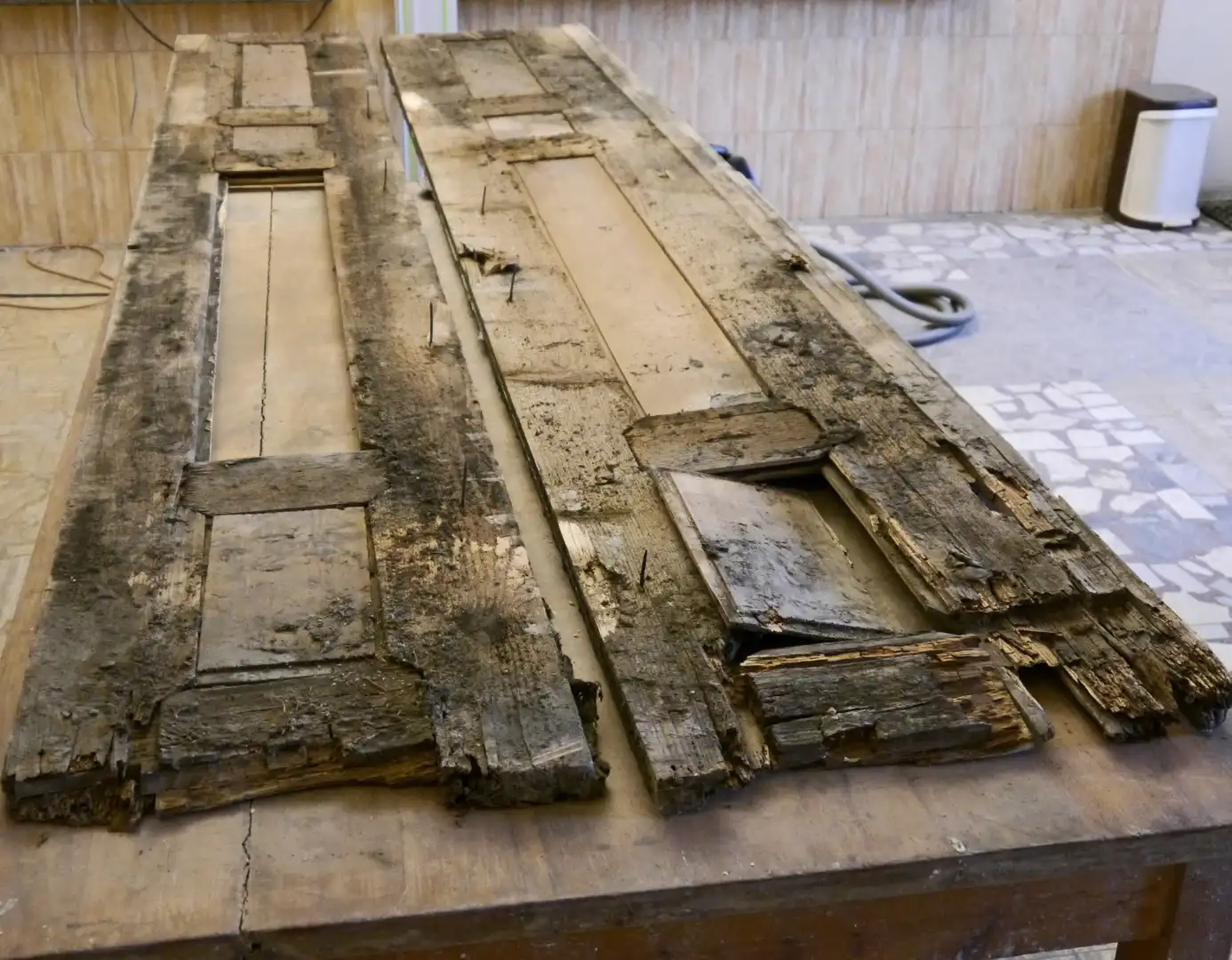 Dveřní křídla po odstranění starých nátěrů a vyjmutí nesoudržných výplní