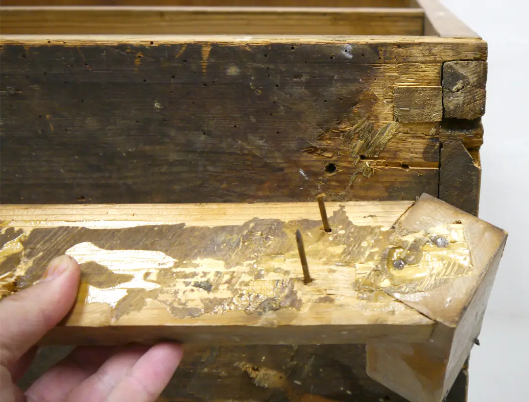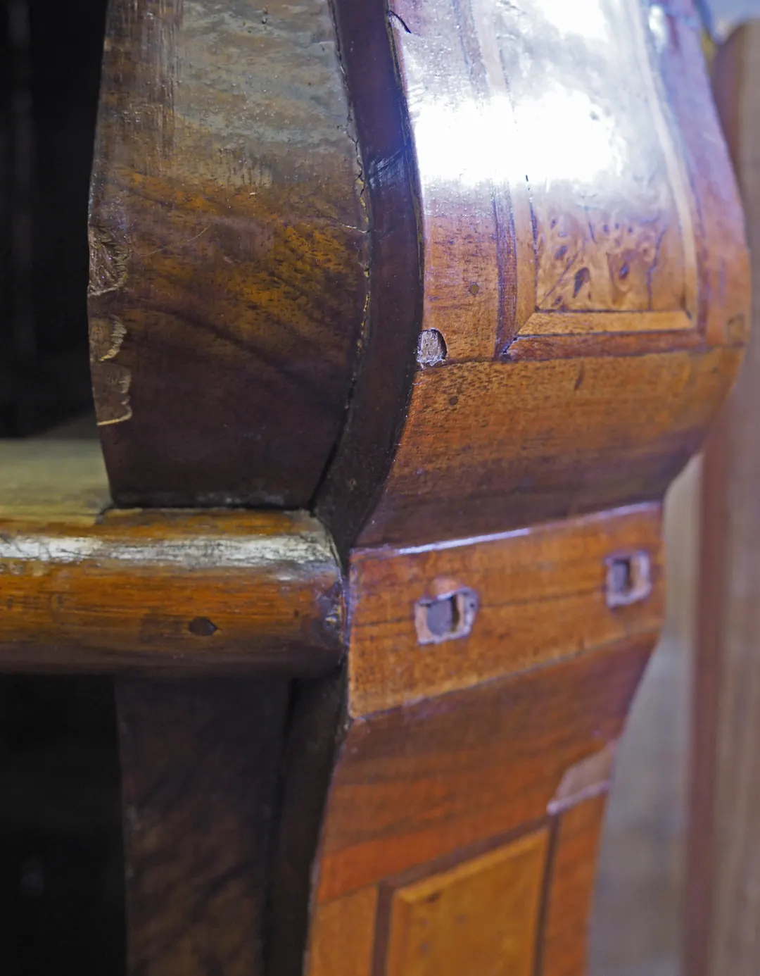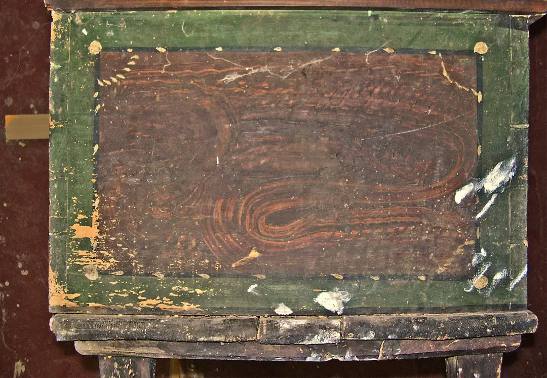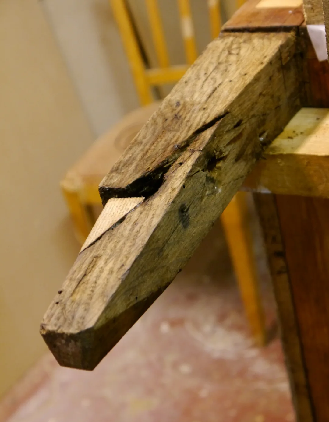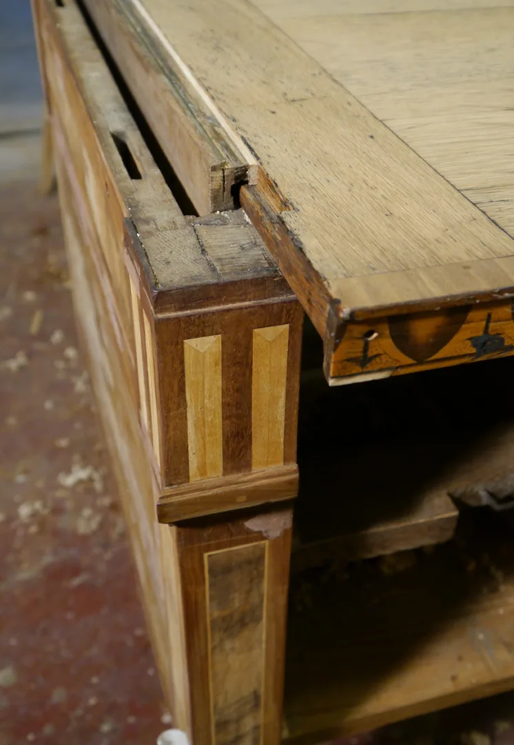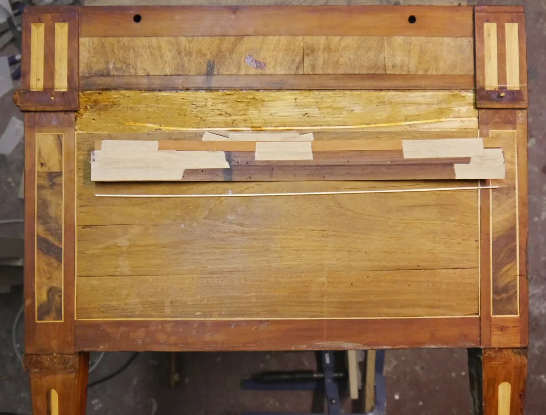 Psací stůl v nálezovém stavu nesl známky dřívějších oprav a repasí.