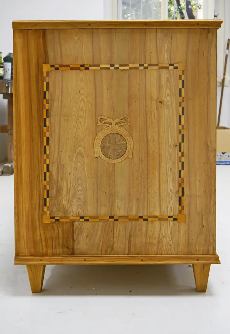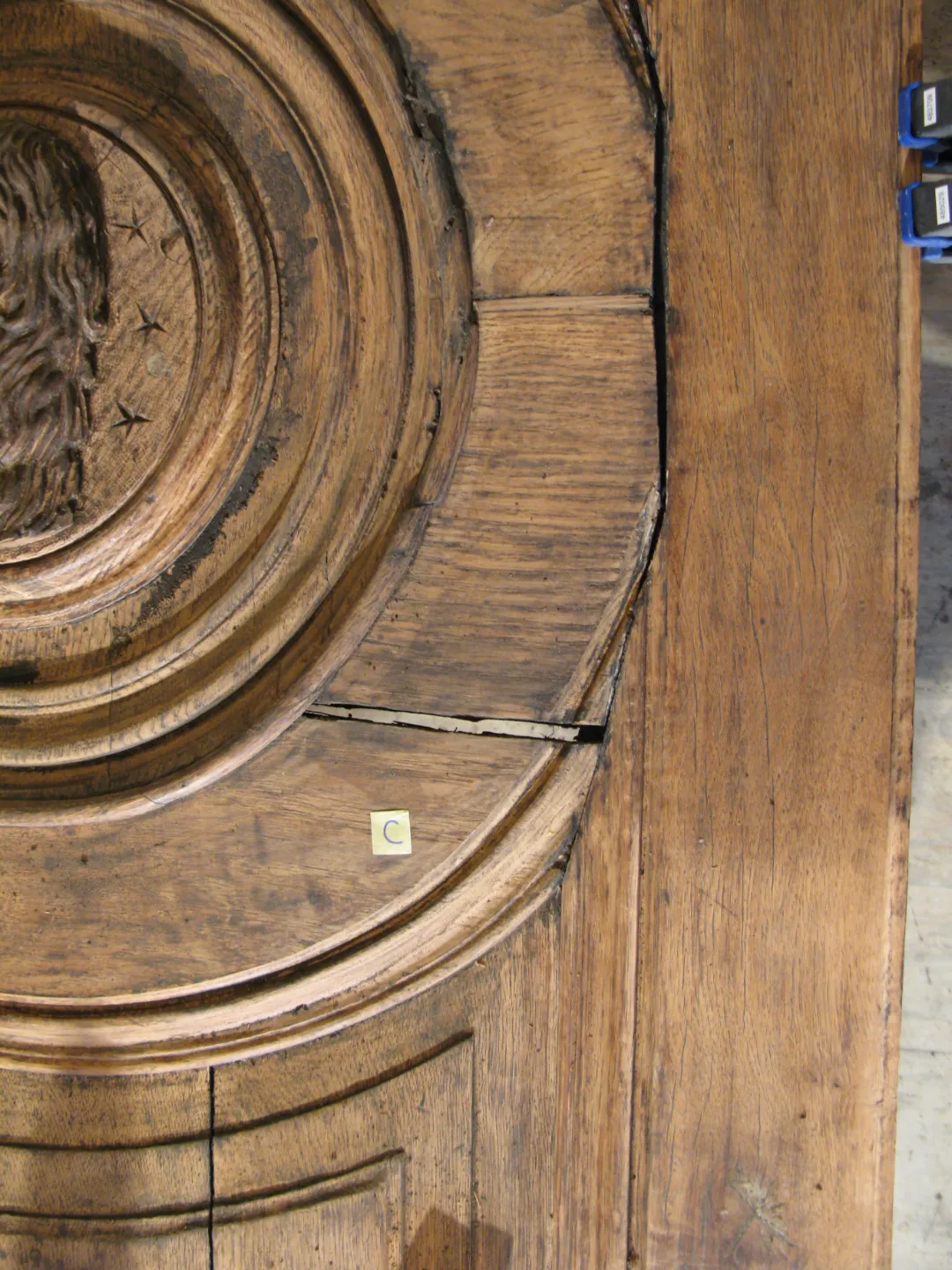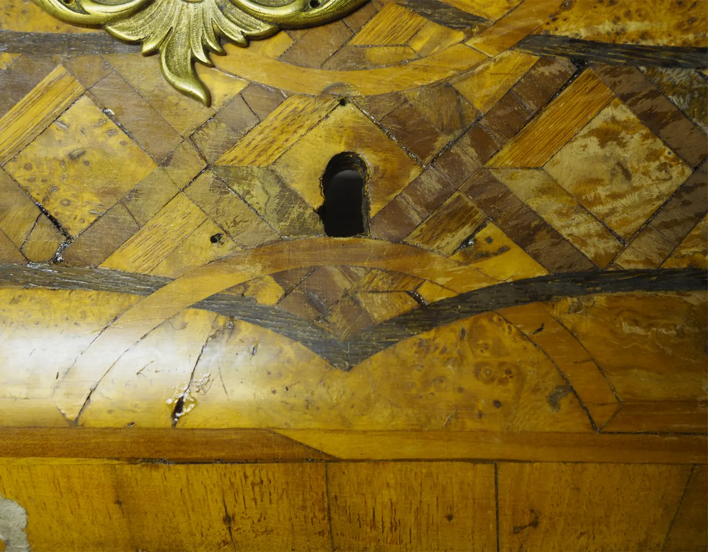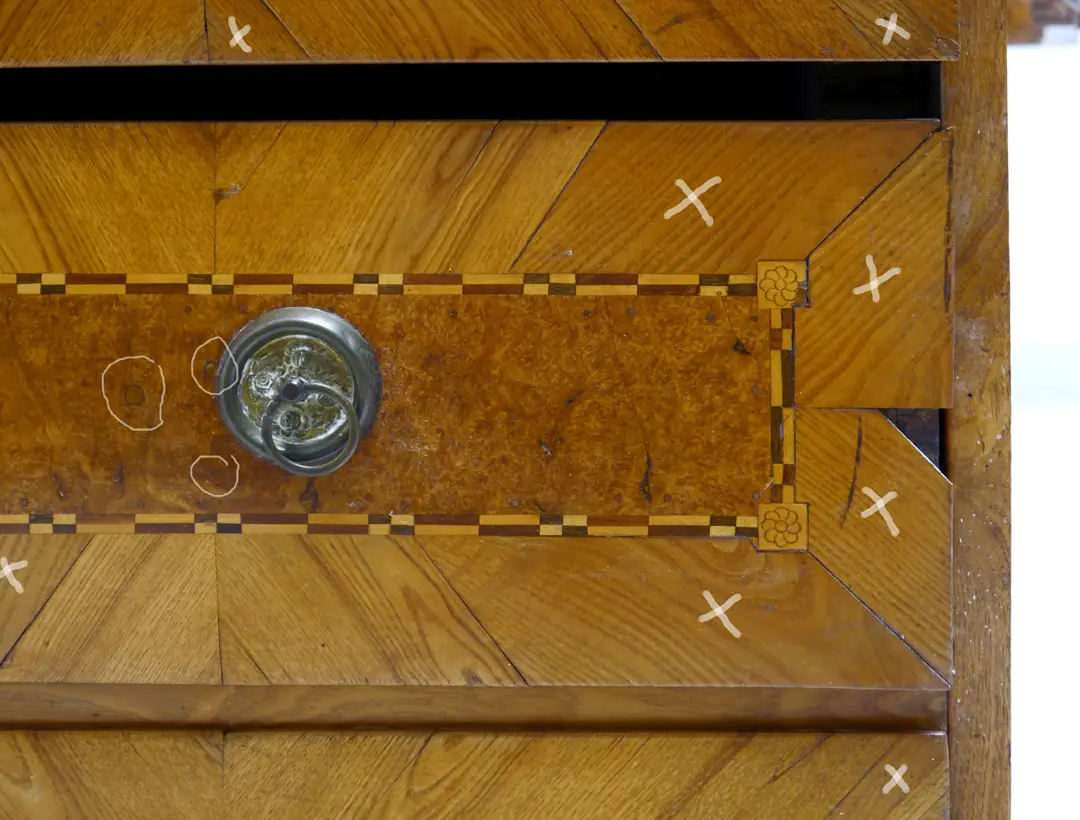 Vzhledem k jinak zachovalému stavu a citlivosti některých dřívějších oprav, byly některé výsazy a tmelové retuše ponechány, jako známka dřívější péče o dílo. Naopak dřívější opravy konstrukcí nohou (které pozměnily jejich tvar či délku) byly odstraněny. Svrchní originální dýhy byly odžehleny a po provedení oprav dubového jádra byly naklíženy zpět na původní místa, aby nedošlo ke ztrátě originální dřevní hmoty. Stejným způsobem byly opraveny trhliny ve spárovkové konstrukci bočních dílců korpusu (odžehlením původních dýh v místě prasklin, truhlářskou výspravou prasklin a opětovném naklížení původních dýh). Pod neoriginálním kováním byly odhaleny obrysy prozrazující přesný obrys původního kování, jehož stylovou náhradu tak bylo možné dohledat.