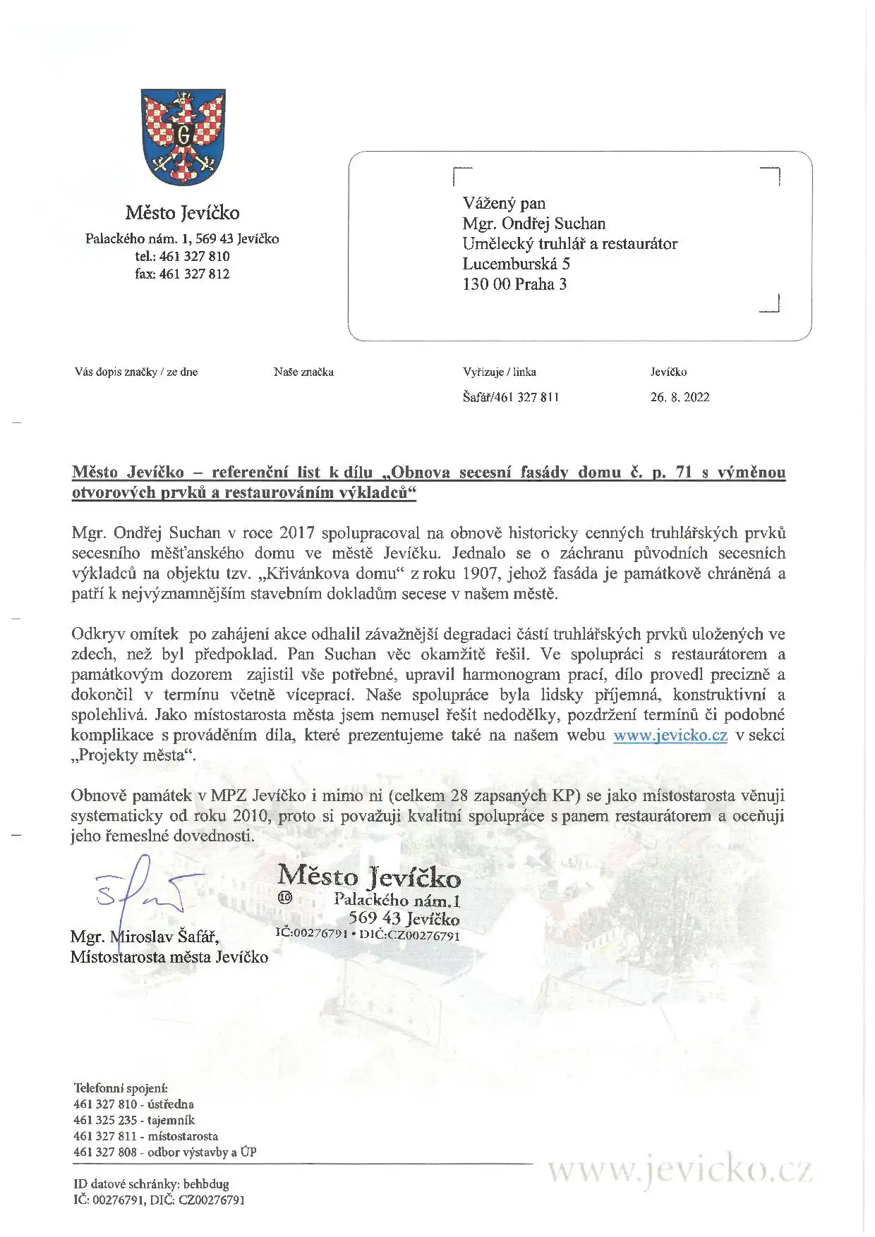 „Kvalitní spolupráce s panem restaurátorem Suchanem si považuji a oceňuji jeho řemeslné dovednosti.“