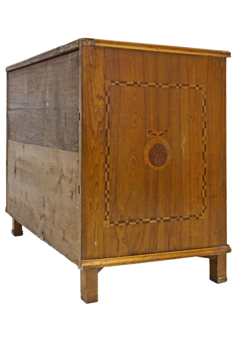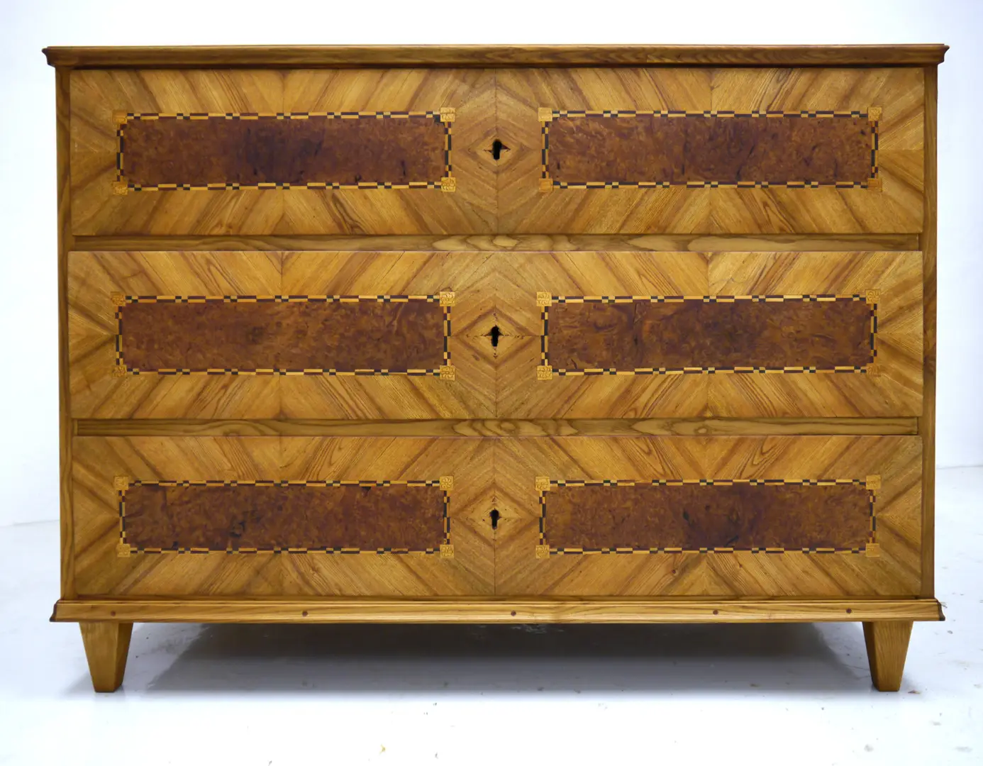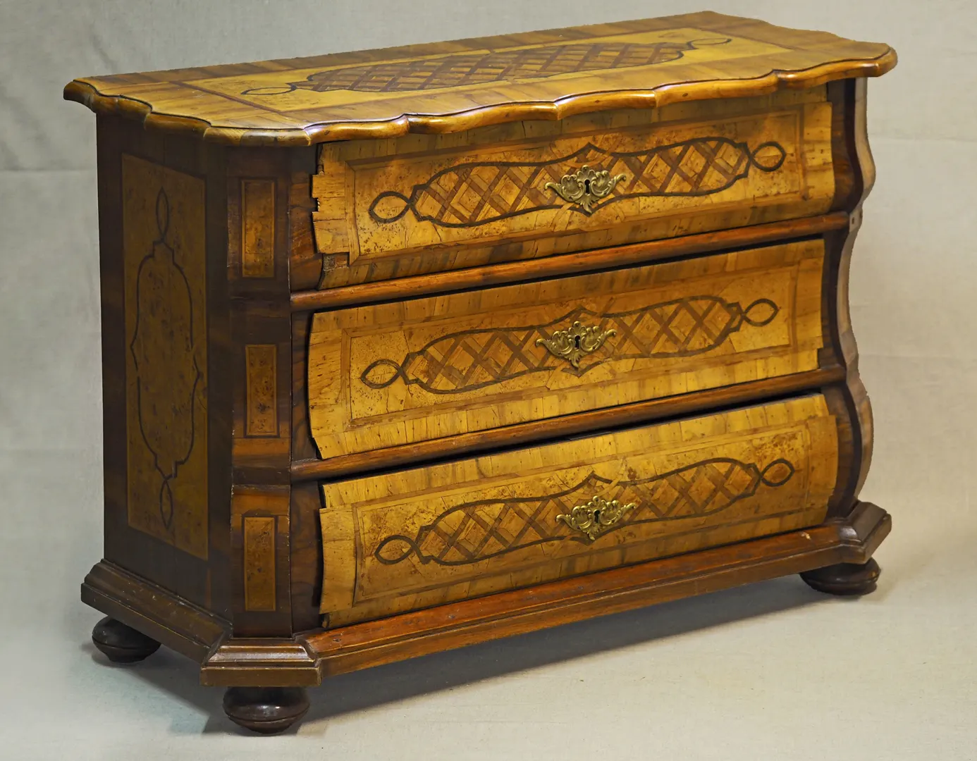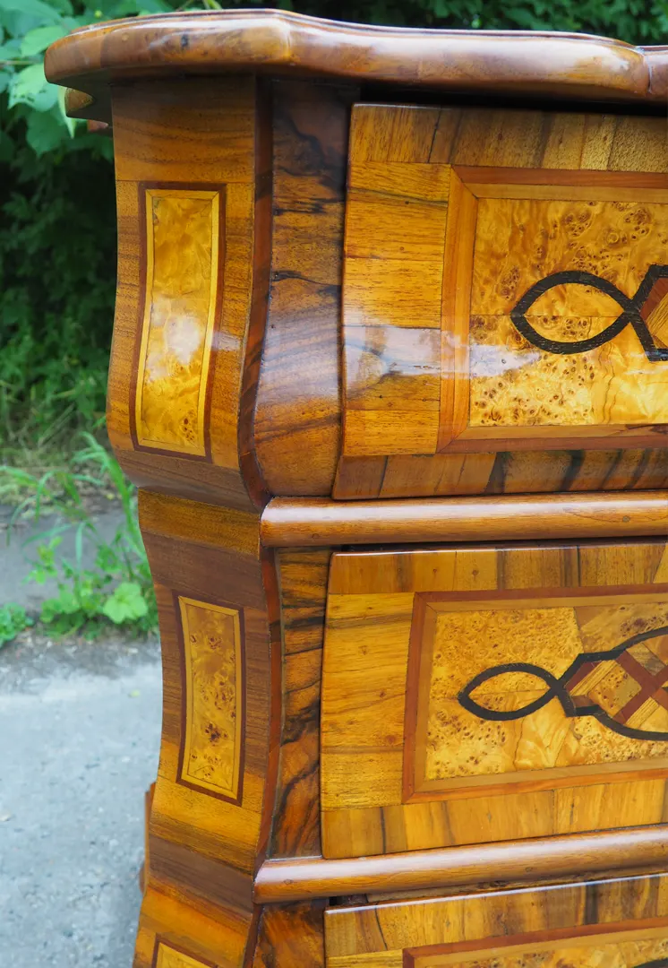 Komoda z konstrukčního hlediska neodpovídala dobovým řemeslným zvyklostem. Konstrukce spojovaná průmyslově lisovanými hřeby pod dýhováním, stopy po strojním hoblování na většině dílců, kombinace dýhování švartnami ořechu, dubu, topolu, švestky na čelech zásuvek a horní desce oproti dýhování krájenými dýhami mahagonu a rovnoletého ořechu na bocích korpusu a sloupkách dokládají slohovou neautentičnost. Z hlediska použitých dekorativních prvků se jedná o směsici barokních a rokokových znaků (např. mřížka, symetrická pásková intarzie, prolamování boků a sloupků v kombinaci s kováním využívajícím motivy rokají). Velmi četné dřívější opravy křídovými tmely, doplnění dřevinami a texturami neodpovídající originálu. Silná degradace povrchové úpravy. Omezená funkčnost zásuvek v důsledku jejich nesoudržnosti.