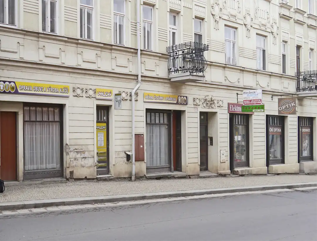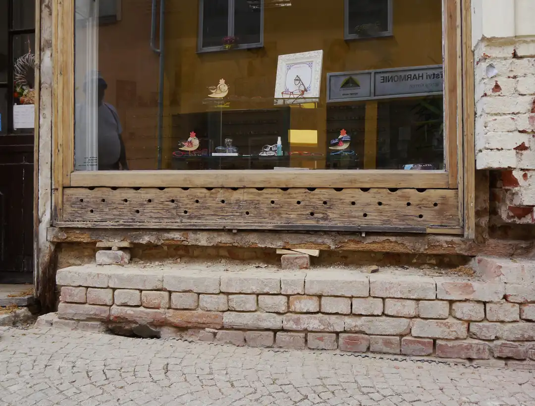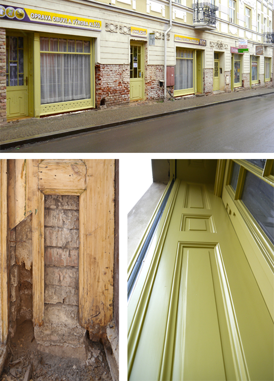 Truhlářské práce při restaurování výkladců proběhly v úzké spolupráci s licencovaným restaurátorem. Na základě námi zpracovaného průzkumu bylo vydáno závazné stanovisko a zahájeny práce na obnově této památky. Po důsledném zdokumentování stávajícího stavu byly výkladce šetrně demontovány. V rámci demontáže a souběžné obnovy fasády, byly obnaženy dřevěné konstrukce pod omítkou a ve zdech a doplněno zjištění jejich stavu (silné napadení hnilobou, nutná výměna cca 20% nosných konstrukcí). V dalším řízení byl pracovníky památkové péče upraven rozsah závazného stanoviska a degradované části nosných konstrukcí mohly být nahrazeny funkčním dřevem a napuštěny fungicidním přípravkem.