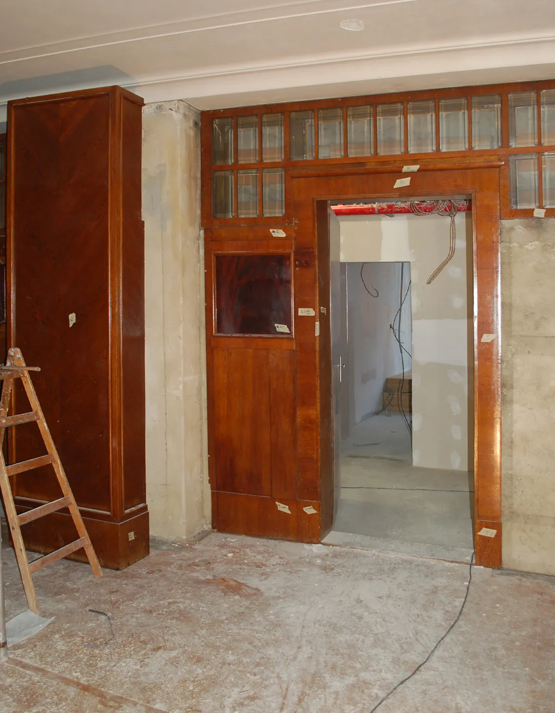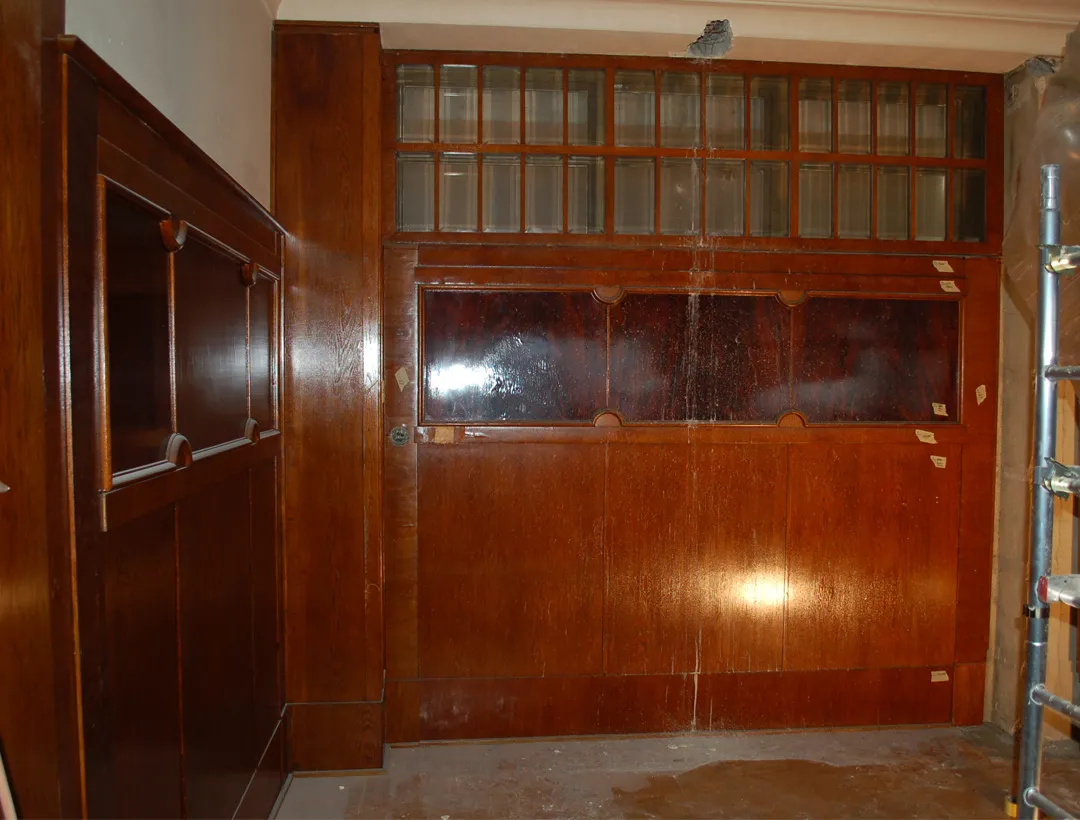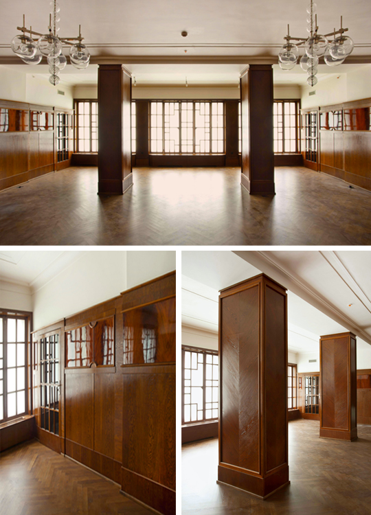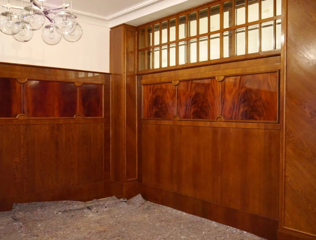 Předmětem restaurování bylo kompletní sejmutí, truhlářské opravy a repase a opětovná montáž dřevěného obložení stěn, světlíkových oken a prosklených předokenních zástěn. Sál proběhl několika dřívějšími rekonstrukcemi. Veškeré dílce nesly známky dřívějších a ne vždy šetrných oprav (dosazování neautentických materiálů, nešetrné výbrusy povrchů a enormní ztenčení originálních dýh, poškození konstrukčních nosičů panelů, nešetrně maskované zásahy a repase v důsledku dřívějších elektroinstalací a instalací radiátorů). Náročné bylo nejen dosazování větších ploch materiálem navazujícím na originál, ale rovněž nekonečné podlepování stovek trhlin, puchýřů a odlupujících se dýh. Samotná instalace opravených panelů vyžadovala maximální přesnost. Panely byly již naformátované a bylo nezbytné je usadit zpět od původních pozic, přestože původní rozměry místnosti se nepatrně změnily důsledkem omítání a zarovnání stěn během rekonstrukce. Také samotné povrchové úpravy šelakem a leštěným lakem byly velmi choulostivé a vyžadovaly enormní péči při manipulaci během instalace.