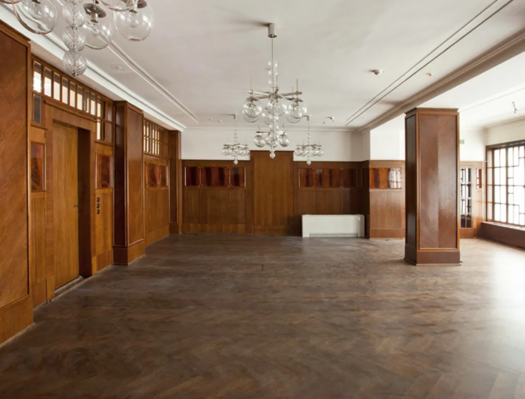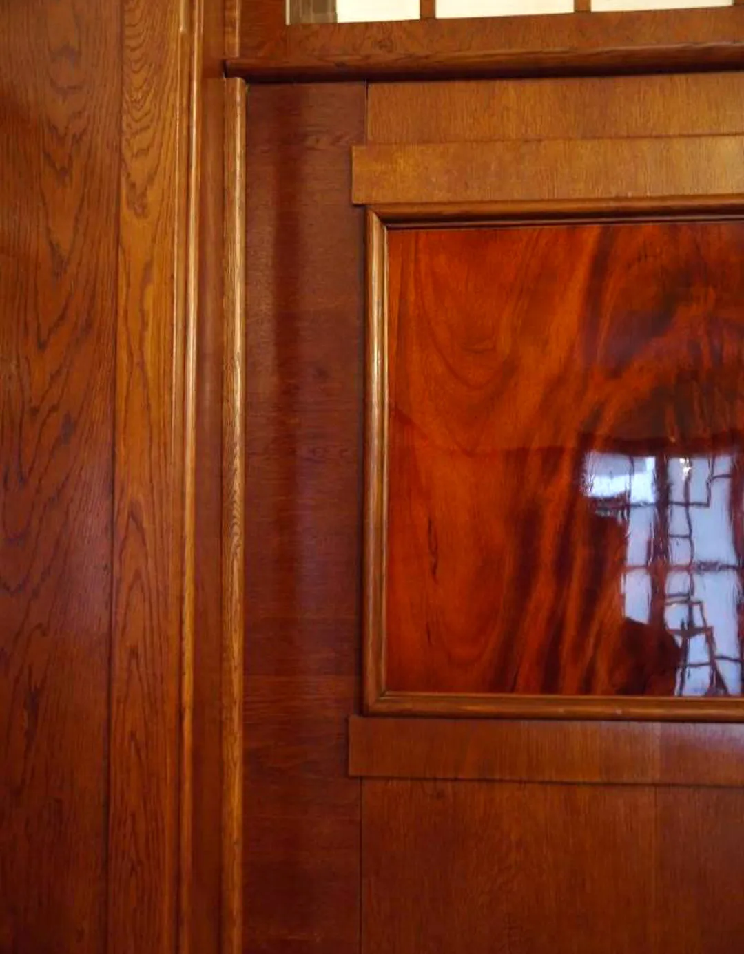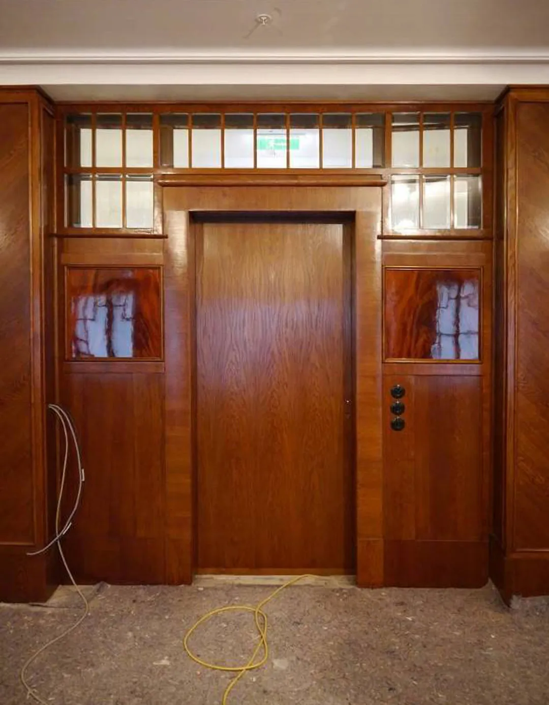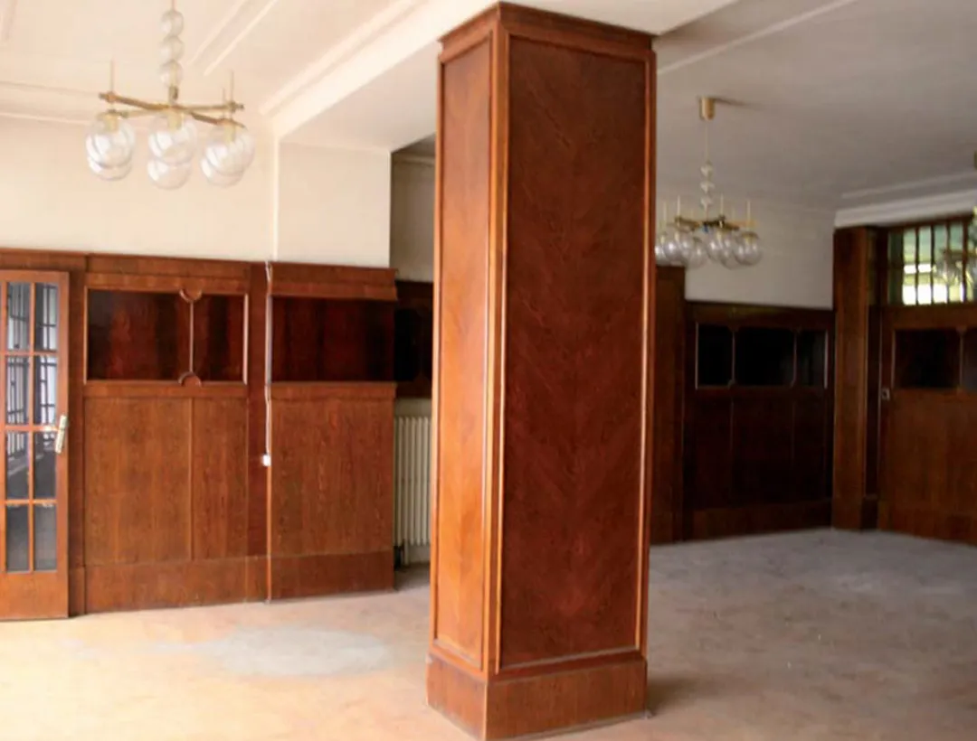 Předmětem restaurování bylo kompletní sejmutí, truhlářské opravy a repase a opětovná montáž dřevěného obložení stěn, světlíkových oken a prosklených předokenních zástěn. Sál proběhl několika dřívějšími rekonstrukcemi. Veškeré dílce nesly známky dřívějších a ne vždy šetrných oprav (dosazování neautentických materiálů, nešetrné výbrusy povrchů a enormní ztenčení originálních dýh, poškození konstrukčních nosičů panelů, nešetrně maskované zásahy a repase v důsledku dřívějších elektroinstalací a instalací radiátorů). Náročné bylo nejen dosazování větších ploch materiálem navazujícím na originál, ale rovněž nekonečné podlepování stovek trhlin, puchýřů a odlupujících se dýh. Samotná instalace opravených panelů vyžadovala maximální přesnost. Panely byly již naformátované a bylo nezbytné je usadit zpět od původních pozic, přestože původní rozměry místnosti se nepatrně změnily důsledkem omítání a zarovnání stěn během rekonstrukce. Také samotné povrchové úpravy šelakem a leštěným lakem byly velmi choulostivé a vyžadovaly enormní péči při manipulaci během instalace.