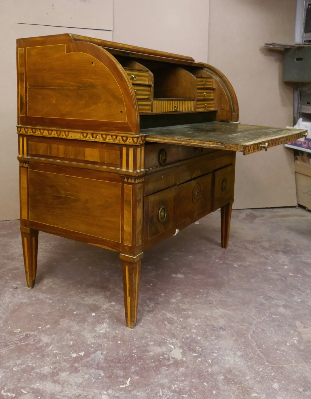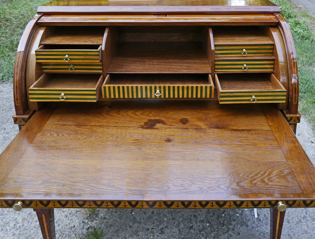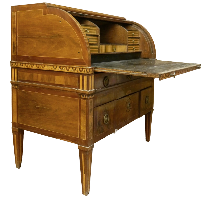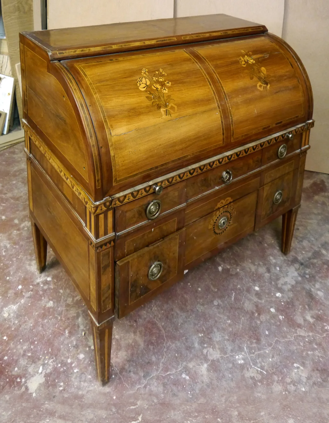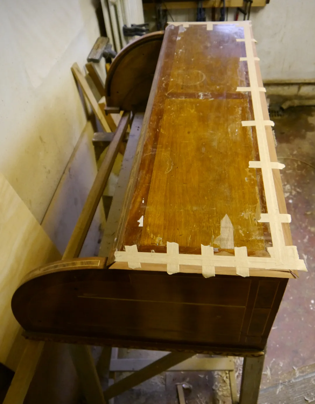 Zejména se jednalo o opravy konstrukcí nohou, nefunkční zásuvky doplněné nepůvodními, spodními, pojezdovými lištami, absentující zámky, nedochované úchyty velkých zásuvek a výsuvné stolové desky, nefunkční výsuv stolové desky a mechanika spojující pracovní desku s cylindrem (válcové víko) a umožňující souběžný chod. Vzhledm k dřívějším opravám všech nohou a úplné výměně jejich spodních částí se nedochovaly stopy po kování či kolečkách nohou.