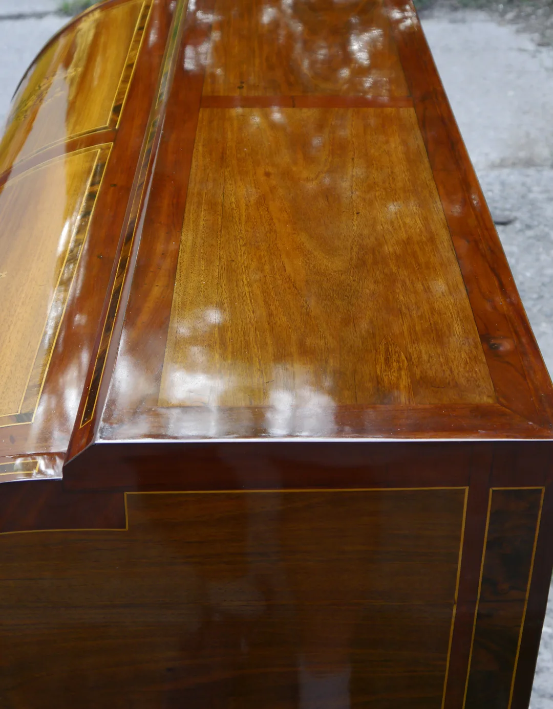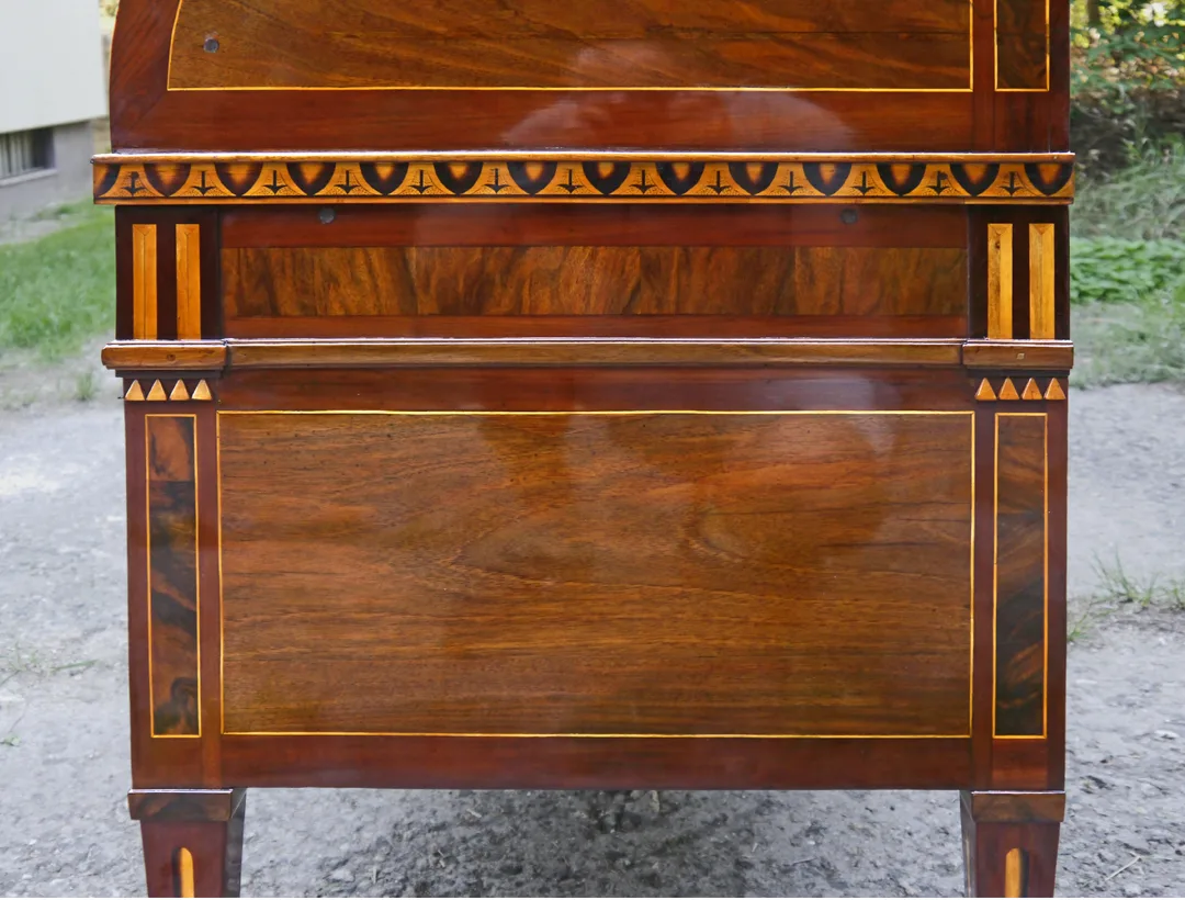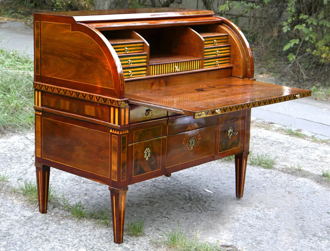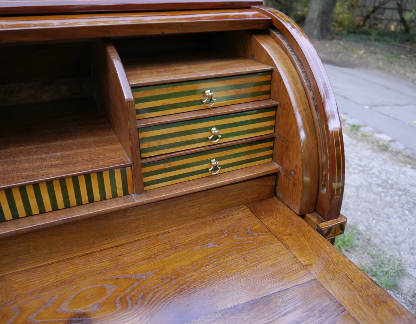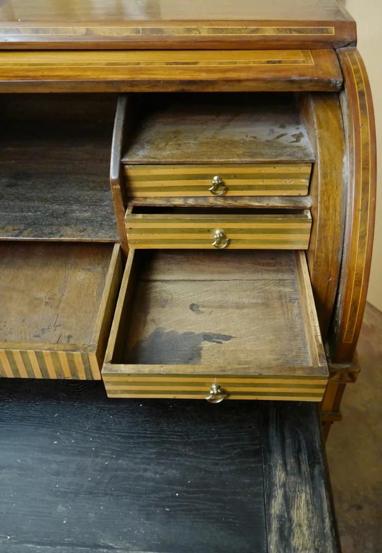 Zejména se jednalo o opravy konstrukcí nohou, nefunkční zásuvky doplněné nepůvodními, spodními, pojezdovými lištami, absentující zámky, nedochované úchyty velkých zásuvek a výsuvné stolové desky, nefunkční výsuv stolové desky a mechanika spojující pracovní desku s cylindrem (válcové víko) a umožňující souběžný chod. Vzhledm k dřívějším opravám všech nohou a úplné výměně jejich spodních částí se nedochovaly stopy po kování či kolečkách nohou.