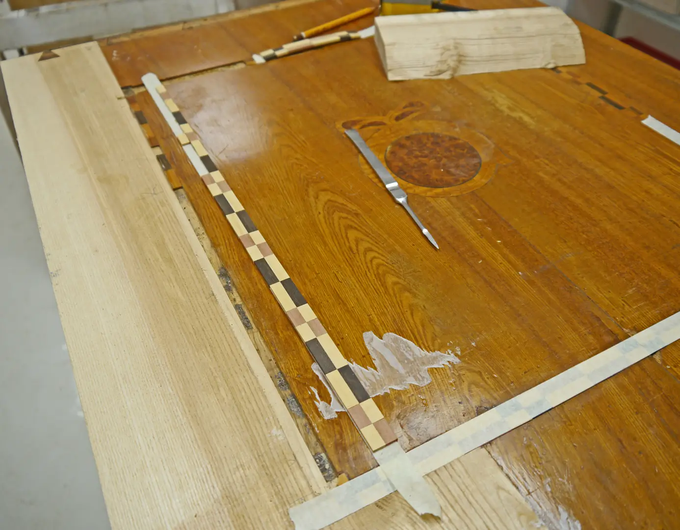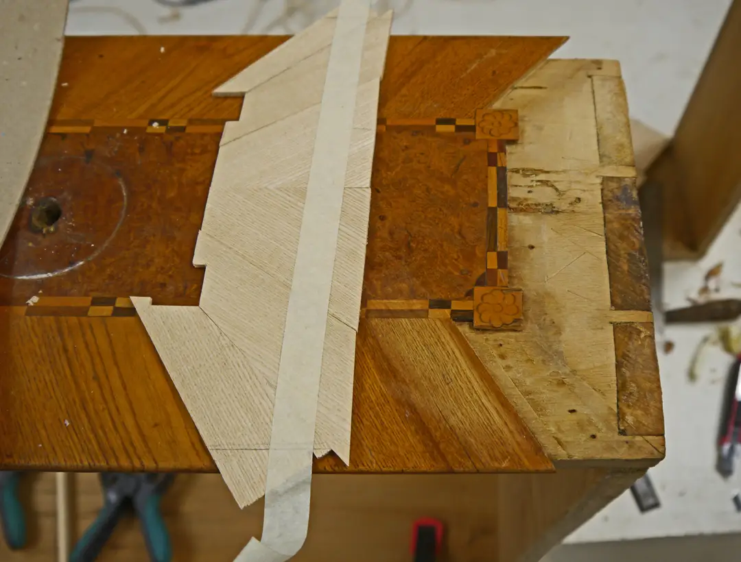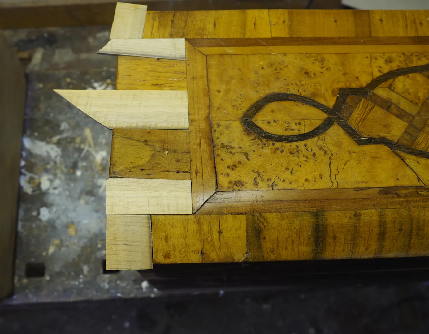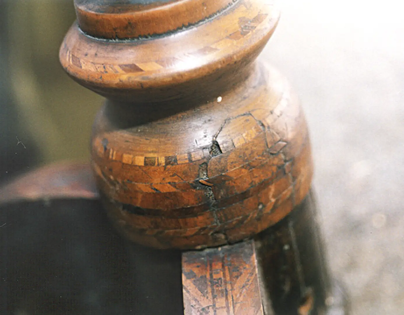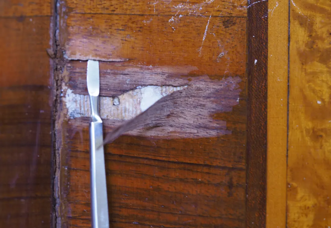 Dřívější oprava ořechové dýhy nevhodným výsazem