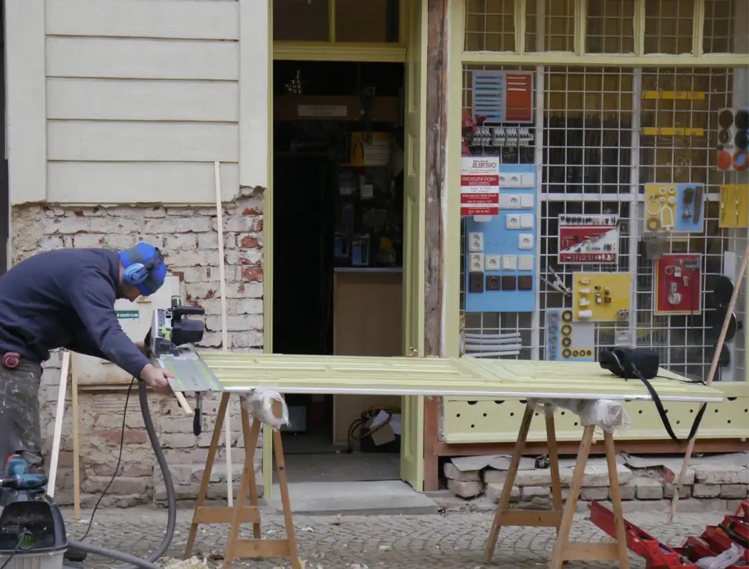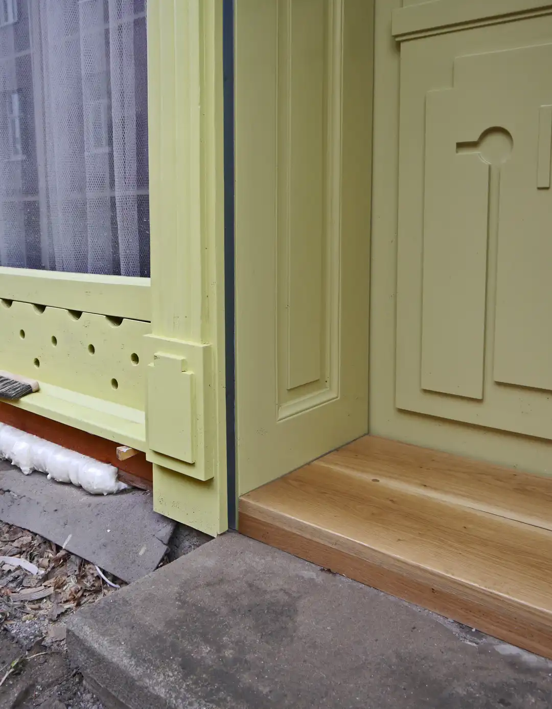 Truhlářské a lakýrnické práce probíhaly na místě i na externím pracovišti. To vyžadovalo nepřetržitou koordinaci našeho týmu s realizující stavební firmou - zednickými pracemi a zahrnovalo spolupráci s dalšími subjekty(sklenáři, záměčníci, pasíři). Truhlářské práce představovaly výměnu a doplnění přibližně 20% degradovaného materiálu nosných konstrukcí, výměnu a doplnění přibližně 15% degradovaného materiálu deštění, výrobu a doplnění dříve odstraněné konstrukce a deštění vstupu výkladce č.1, výrobu a instalaci replik 2 ks dveří, odvětrávacích vstupních soklů, repasi funkčnosti dveří a okenních nadsvětlíků a dále kompletní sejmutí a rekonstrukci nefunkčních povrchových úprav. . Veškeré práce byly realizovány pod vedením licencovaného restaurátora a pracovníků památkové péče.