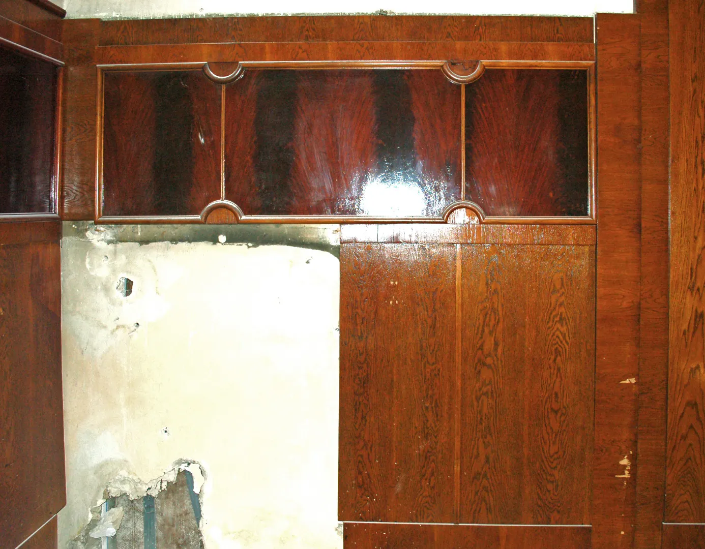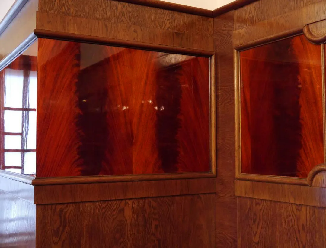 Stěny místnosti do cca 2,5 m výšky obloženy dřevěnou paneláží využívající odlišných barev a reflexů dubového (konstrukce) a mahagonového (výplně) dýhování. Jádro panelů tvoří laťovkové desky, z lícové strany dýhované kombinací dubových a mahagonových dýh. Vlivem mikroklimatických změn v průběhu času došlo k silným poškozením; tj. borcení vrstev jádrové desky, které se viditelně projevilo silným vypraskáváním svrchních, pohledových dýh. Ve značném rozsahu se dýhy odlupují od podkladu a v puchýřích i celých pásech odpadávají. Dílcovou demontáží obkladních panelů na prvodílce bylo jištěno, že mahagonové i dubové výplně nebyly v rámci celého sálu konstruovány jednotně. Některé panely byly zkonstruovány z rámu opláštěného vrstvenou překližkou a dále dýhována svrchní pohledovou dýhou (mahagon). Ta byla v rozporu s technologickými zvyklostmi naklížena ve stejném směru vláken s podkladem, což způsobilo zvýšené povrchové pnutí, jehož důsledkem došlo k četnému vypraskávání jak povrchové dýhy tak i poddýžky. V tomto smyslu lze považovat popsaný jev za výrobní vadu, neboť k němu došlo v důsledku nedodržení správné technologie výrobcem.