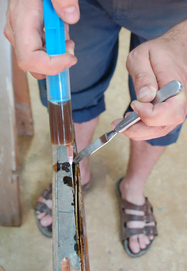 Detail rozeschnutí spojů a trhlina po sejmutí nátěrů