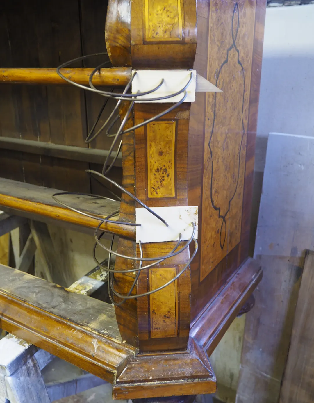Nesoudržné dýhy byly podlepeny klihem a doplněny odpovídajícícm materiálem. Ocelové hřeby byly zapuštěny hlouběji do konstrukcí a překryty poddyžkou a opětovně předýhovány původní (odžehlenou) dýhou. Iluzivní malba páskové intarzie na bocích byla sejmuta. Trhliny v konstrukcích byly vysazené dřevem a zaretušované. Konečná povrchová úprava byla provedena šelakovou politurou ve vysokém lesku.