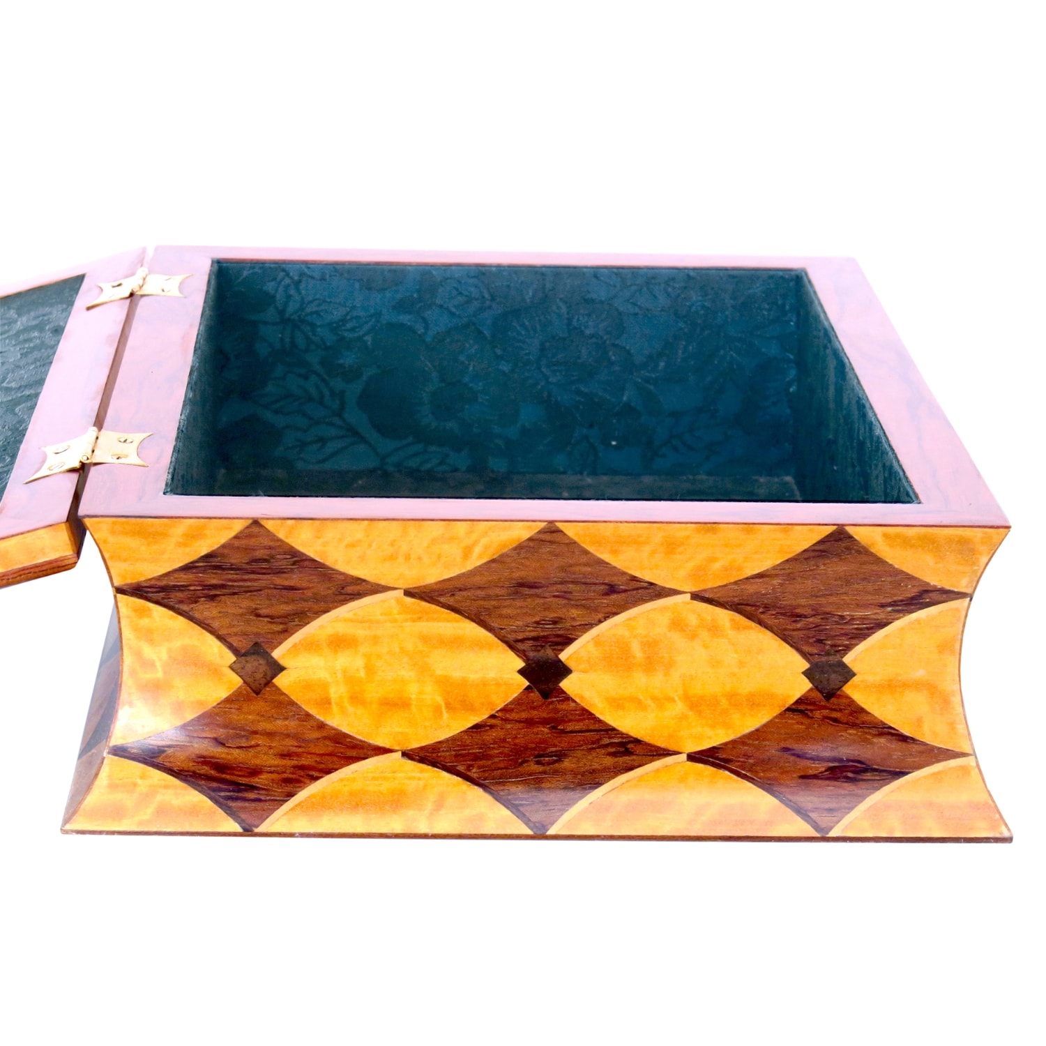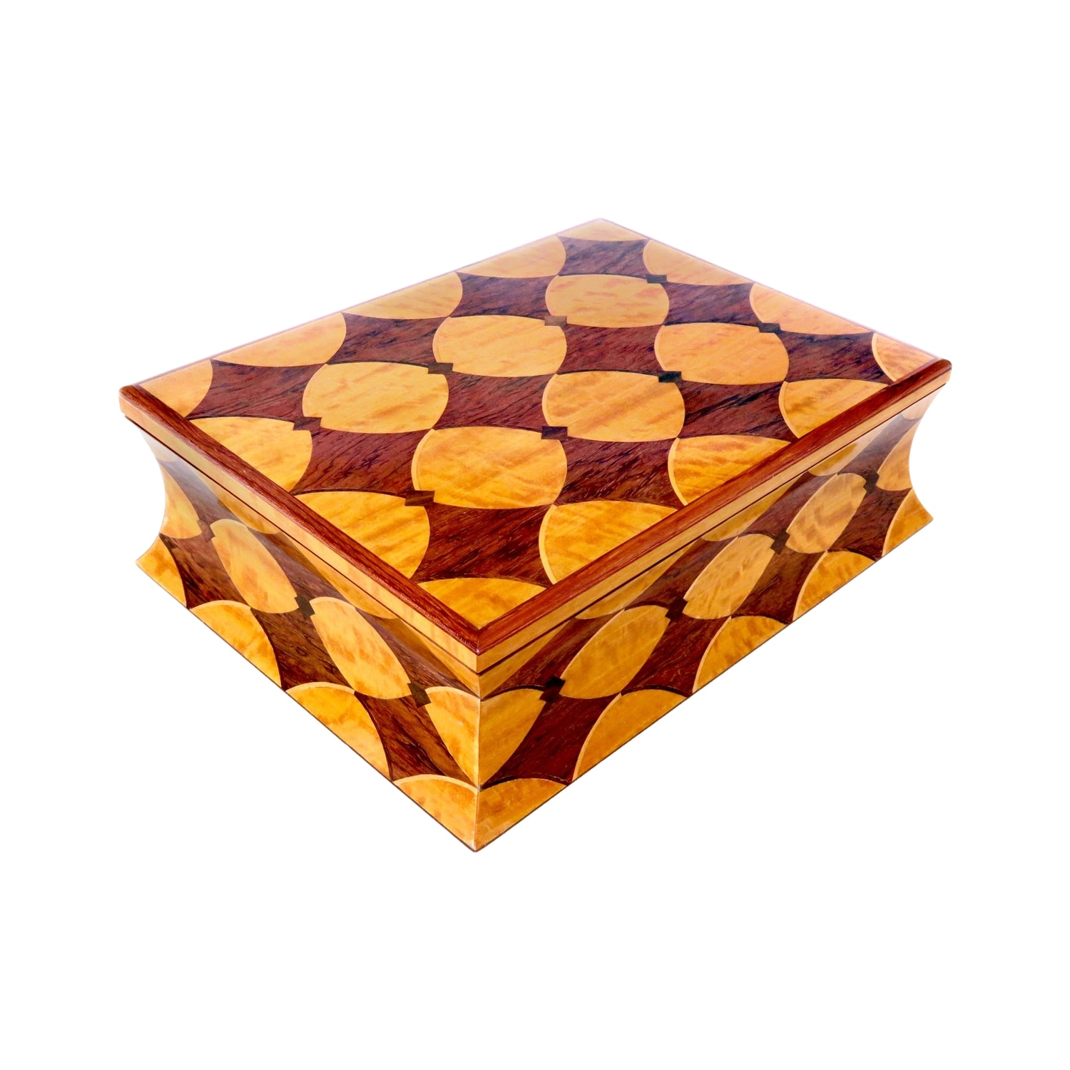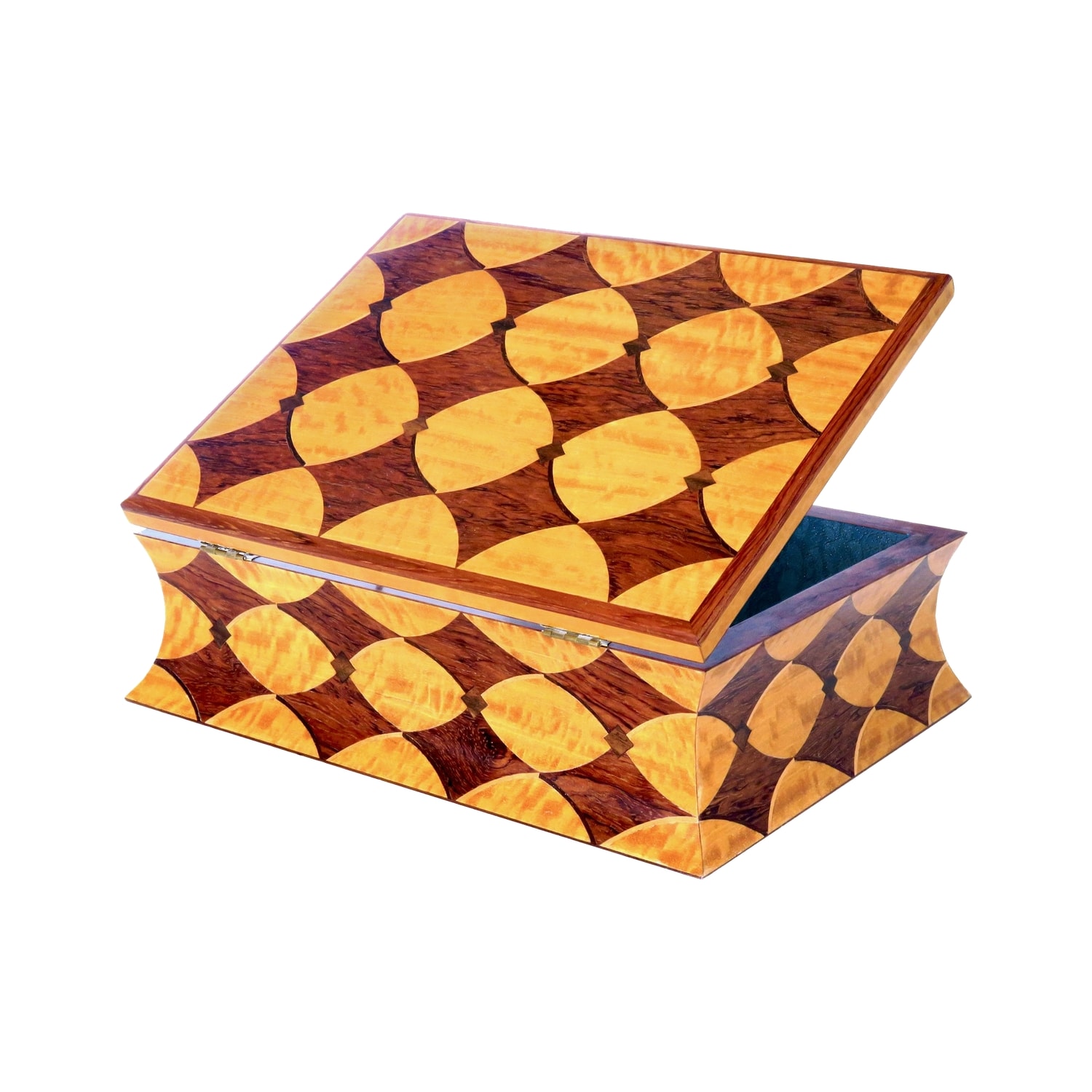Využívá kresbu chvějivých světelných reflexů citroníkového dřeva, přes které se rozpíná intarzie zeštíhlených kosodelníků z africké růže stínované hrušní a palisandrem. Motiv růže se opakuje na látkovém potahu centrálního úložného prostoru a ručně vyřezávaných mosazných pantech. Právě souzvuk jemných charakterů použitých dřevin a jejich kontrast s pichlavou geometrií výzdobného motivu, poodkrývá příběh o dívce, které jsem tuto krabičku vyrobil ale nikdy nepředal.