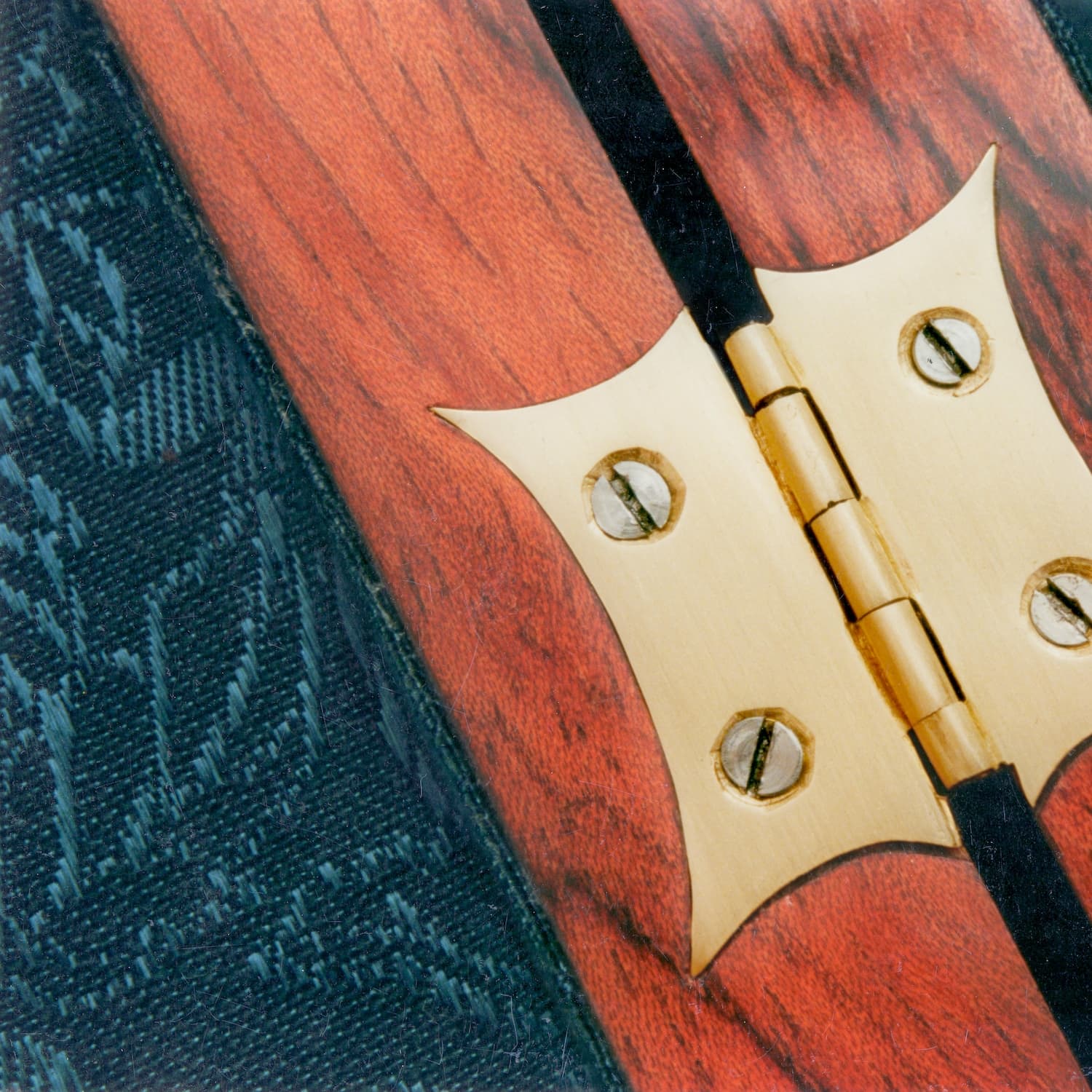 Korpus z ořechu a třešně, vykládáno švestkou a citroníkem. Čalouněno vínovým saténem.