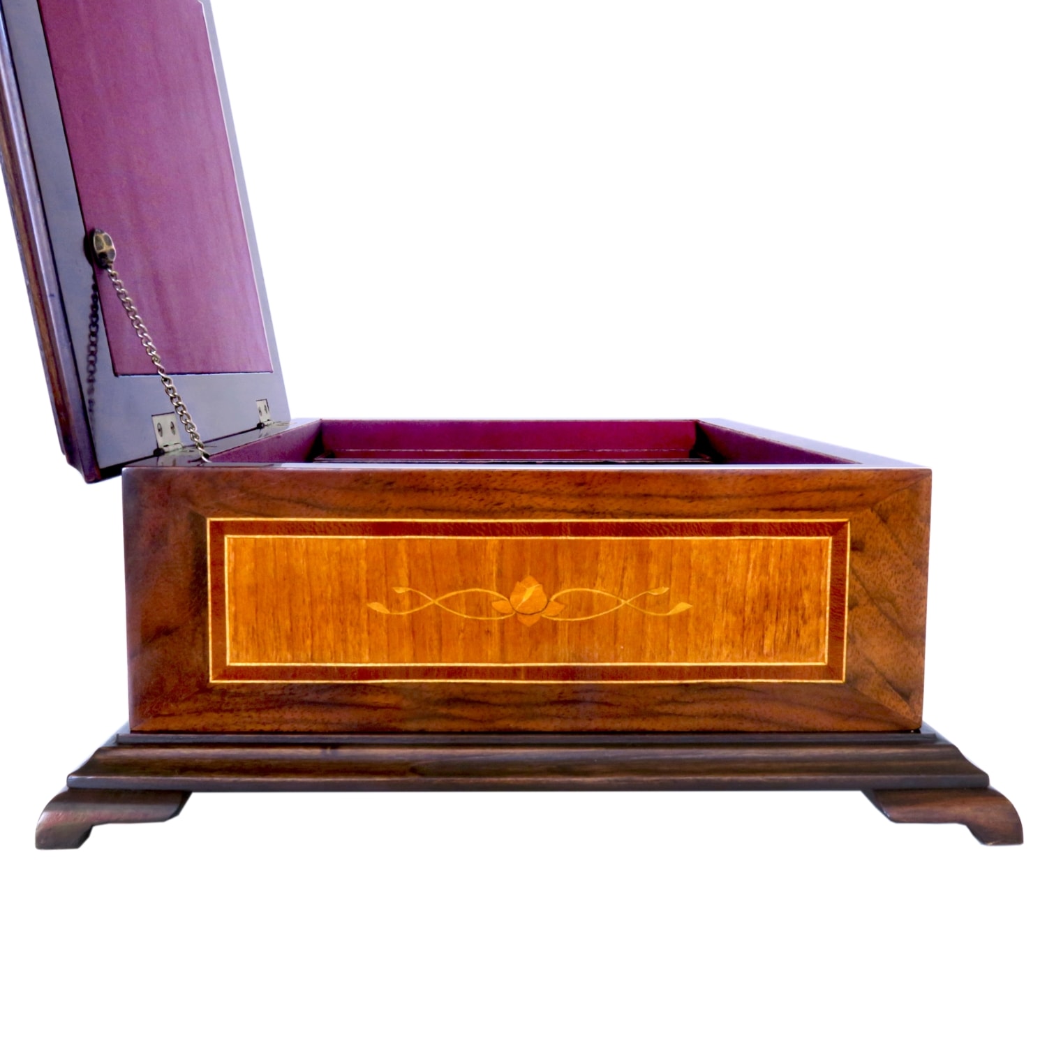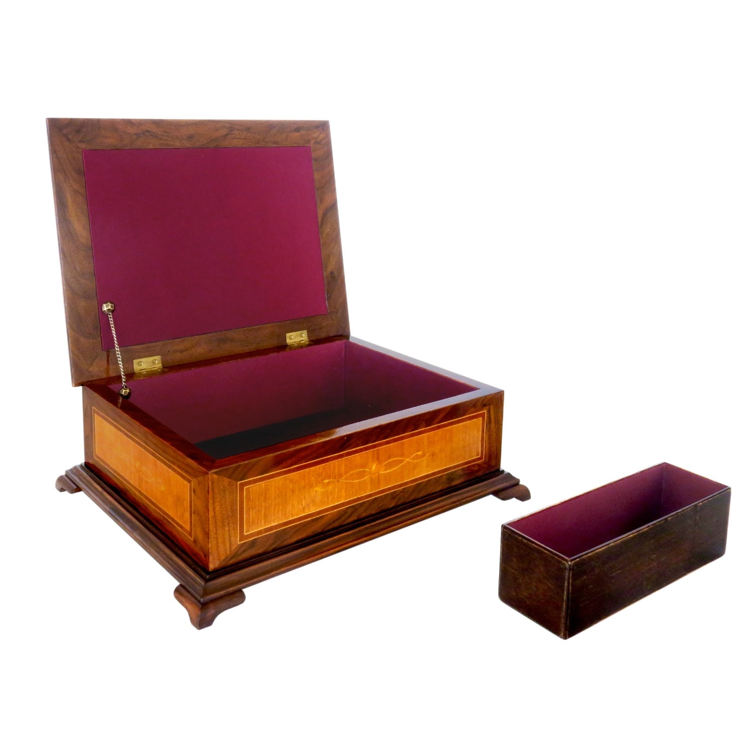 Korpus z ořechu a třešně, vykládáno švestkou a citroníkem. Čalouněno vínovým saténem.