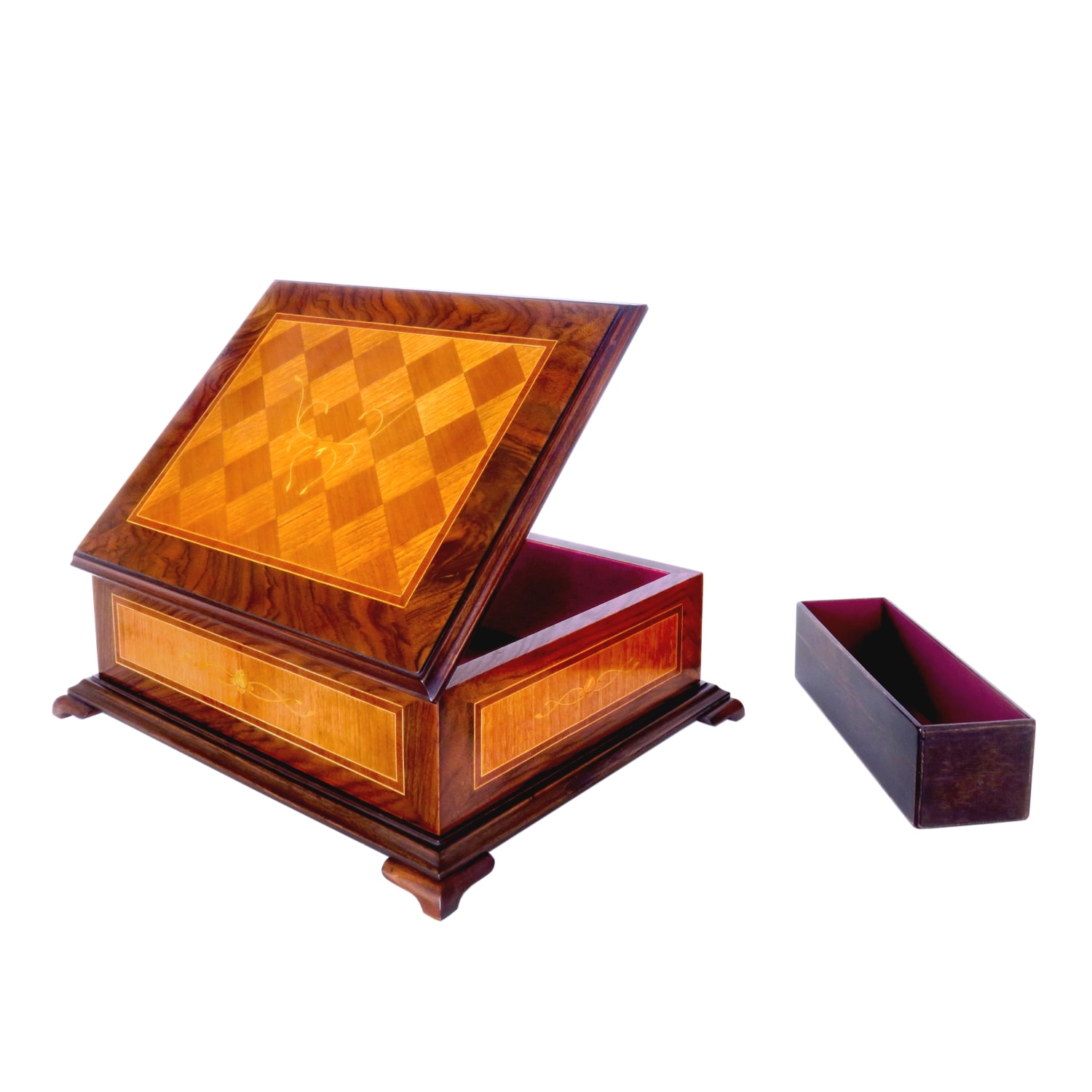 Byla poprvé vyrobena na objednávku jako výroční dar pro manželku mého strýce. Bohatá pásková intarzie švestkou a květinová inkrustace citroníkem do třešňové parketáže dokládají množství práce a citu vloženého do díla. To z něj činí nejen exkluzivní dar, ale také příležitost vychutnat klasické řemeslo. Jiskru dodává celému výrobku tradiční leštění šelakovou politurou do vysokého lesku v odstínu tmavého pomeranče.
