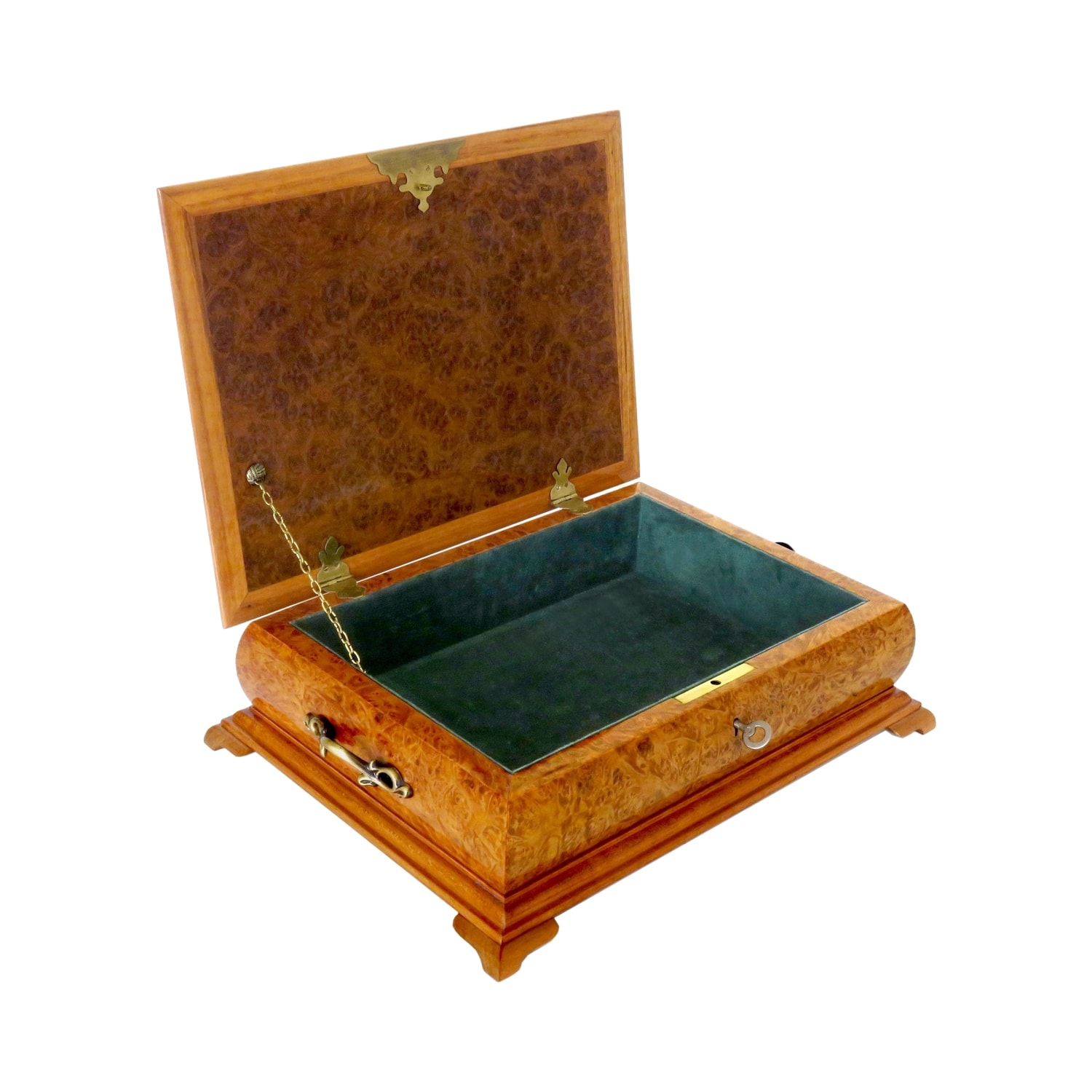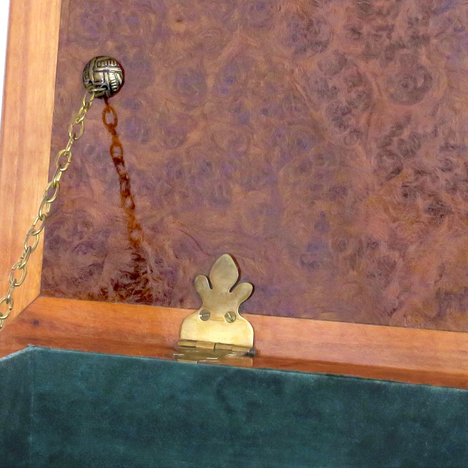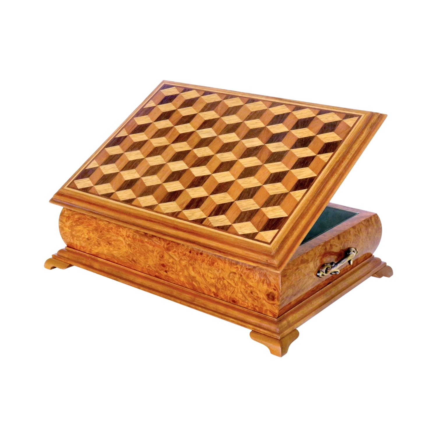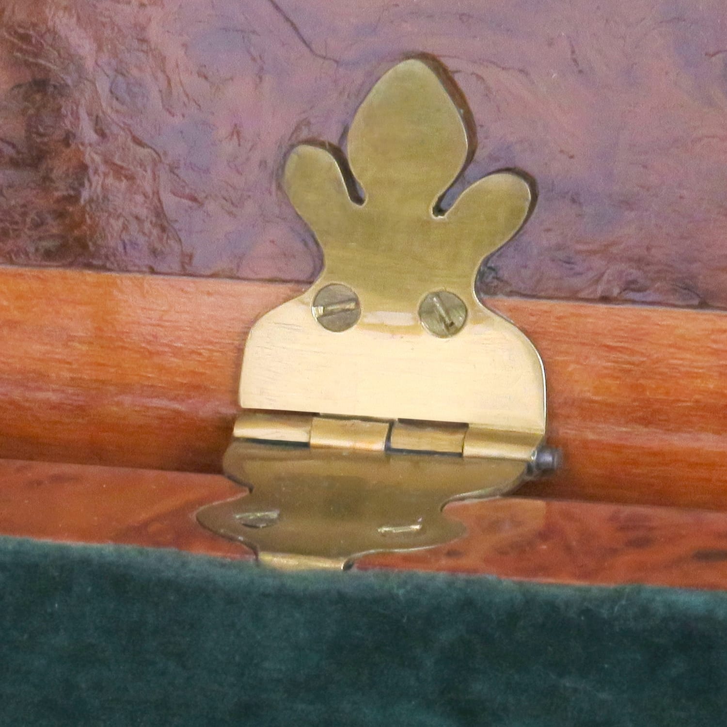 Korpus z třešňové kořenice, motiv na víku - limba, palisandr, třešeň. Čalouněno zeleným sametem.